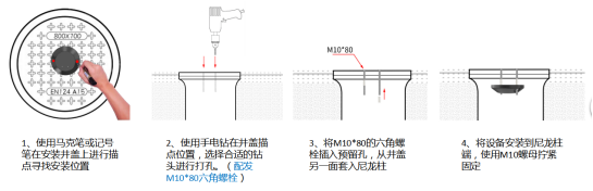 针对复合材料或非金属材料井盖,为了不破坏井盖自身的结构,可使用工装将监测终端固定于井盖上,可将监测终端固定于井盖上。